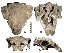 The skull is somewhat elongated and pointy, measuring 295 by 283 millimetres in the holotype. The top profile of the skull is convex, the rear skull roof curving below the level of the upper rim of the eye sockets. The quadrate is very strongly inclined to the rear. The occipital condyle, the contact with the neck, is obliquely pointing to below, an ankylosaurid trait causing the head to be pointing downwards. The beak is toothless. The tooth rows of the maxillae are rather straight and each consist of fifteen to sixteen small teeth, lacking a true cingulum, swollen basis. There is no armour on the snout. More to the rear the bony tiles of the skull roof, the caputegulae, are rather indistinctively patterned though a small central plate on the parietal bones is visible. The squamosal horns, at the rear skull corners, and jugal horns, at the cheeks, are small.[2]