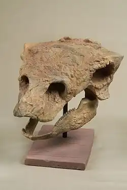The type specimen of Gastonia burgei (CEUM 1307) was discovered in a bonebed from the limestone strata of the lower Cedar Mountain Formation in Yellow Cat Quarry, Grand County, eastern Utah, the type specimen consisting of a single skull.[1][2] The type specimen was found alongside 4 partial skeletons of Gastonia that were placed as paratypes, along with the type specimen of Utahraptor and an iguanodontid.[1][2] Gastonia is among the most common dinosaur fossils in the Cedar Mountain Formation, with many individuals being found across several quarries in the southwest.[1][2] In 2004, the number of skulls was reported as four,[3] in 2014 this had risen to ten.[4] Gastonia was formally named and described by James Kirkland in 1998, from the holotype specimen and other fossil material recovered beginning in 1989.[2] The name Gastonia honors US paleo artist and CEO of Gaston Design Inc. Robert Gaston. The species G. burgei was named for the director of the College of Eastern Utah Prehistoric Museum, Donald L. Burge.[2]