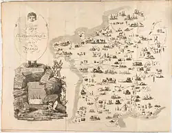This is the first example of a carte gastronomique, a map that summarizes a country by its products at the outset of the "Cours Gastronomique" by Charles Louis Cadet de Gassicourt (1809).