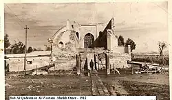 - Bab al-Talsim (Arabic: باب الطلسم), also known as Bab al-Halba or Talisman Gate, was expanded and restored in 1220 by Caliph al-Nasir, who left a decorative friezes and inscriptions around the gate. The gate was destroyed by the Ottoman troops in 1917 during their withdrawal from Baghdad, in order to prevent it from being turned into a warehouse by the advancing Allied forces.[2][3] The gate was already described by Ibn Jubayr in 1185, and is mentioned in the accounts of the Mongol Siege of Baghdad (1258). Before 1221, it was known as the "White gate" (Bab Halba). A polo field in front of the gate was inaugurated in 1086 by Seljuk sultan Malik Shah. In 1638, the gate was closed and bricked over by the Ottoman Sultan Murad IV after his conquest of the city. The stone figures representing a ruler sitting cross-legged between two dragons have not been securely attributed to any ruler, but may belong to the period of Murad IV.[4][5][6] The cross-legged ruler may also be personification of the sun.[7][8]