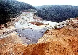 Gathright Dam is an earthen and rolled rock-fill embankment dam on the Jackson River 19 miles (31 km) north of Covington, Virginia. The dam is 257 feet (78 m) tall and 1,310 feet (400 m) long and has a controlled spillway within the structure's southern portion. It creates Lake Moomaw, which has a normal volume of 40 billion US gallons (150,000,000 m3). The dam serves flood control and recreational purposes and is operated by the U.S. Army Corps of Engineers.[2]