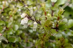 Gaultheria antipoda is an upright or spreading shrub that grows to 1–2 metres (3.3–6.6 ft) high. The leaves are 5–15 mm (0.20–0.59 in) long, and are leathery, shiny, with small serrations. G. antipoda flowers around November, followed by white to red berries in late summer and autumn.[2] Unlike some other Gaultheria species that exhibit gynodioecy, G. antipoda is a hermaphroditic species (the individuals produce both pollen and seeds).[3]