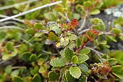 In Australia, Gaultheria depressa is a prostrate shrub 10 to 20 cm (4 to 8 in) high and 50 to 150 cm (19.5 to 59 in) across. It grows larger in New Zealand. The small leaves can be oval or round and measure 0.5 to 1 cm (0.20 to 0.39 in) in length and have serrate margins. The small white tubular flowers appear from September to January and are followed by white or red fruit which is around 1 cm (0.39 in) in diameter.[4] The berries are edible.