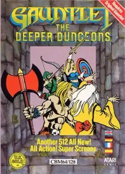 Gauntlet: The Deeper Dungeons is an expansion pack for the original computer ports of Gauntlet with 512 new levels.[1][2][3][4][5][6] The player requires the original game to play the expansion.[1][3][6] Available player characters are Merlin the Wizard, Thor the Warrior, Thyra the Valkyrie, and Questor the Elf.[2][4][6]