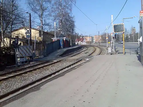 The arrival of the station spurred housing development in the area. After the 1940s the area also received some condominiums. The National Hospital was moved to Gaustad in 1999, falling within the catchment area of the station.[2] The station closed in 2009 for the line to be upgraded,[3] and opened again on 6 December 2010.[4] There was not time for an outright upgrade to the stations, so Gaustad remains with its pre-upgrade platforms and amenities.[5]