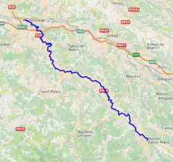 The Gave d'Oloron (French pronunciation: [ɡav dɔlɔʁɔ̃]) is a river of south-western France near the border with Spain. It takes its name from the city Oloron-Sainte-Marie, where it is formed from the rivers Gave d'Aspe and Gave d'Ossau. It joins the Gave de Pau in Peyrehorade to form the Gaves réunis, a tributary of the Adour. The Gave d'Oloron is used for fishing. The river is 148 kilometres (92 mi) long, including its source rivers Gave d'Ossau and Gave du Brousset.[1] Near Sauveterre-de-Béarn it takes up its largest tributary, the Saison.