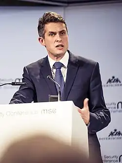 Sir Gavin Alexander Williamson CBE (born 25 June 1976) is a British politician who served in various Cabinet positions under Prime Ministers Theresa May, Boris Johnson and Rishi Sunak between 2016 and 2022, lastly as Minister of State without Portfolio from 25 October to 8 November 2022 under Sunak. A member of the Conservative Party, he has been the Member of Parliament (MP) for Stone, Great Wyrley and Penkridge, formerly South Staffordshire, since 2010. Williamson previously served as Government Chief Whip from 2016 to 2017 and Secretary of State for Defence from 2017 to 2019 under May, and as Secretary of State for Education from 2019 to 2021 under Johnson.