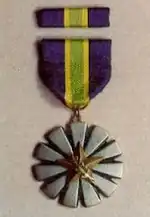 The medal is of circular design with 11 silver rays, between the arms of the rays is dark blue. In the center of the rays is a gold star. Superimposed diagonally on the star is a single branch of laurel leaves in light—green.[1]