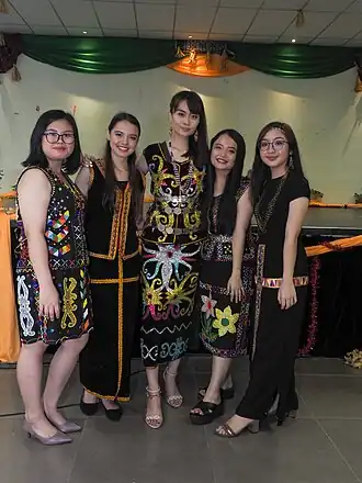 Gawai Dayak is celebrated by ethnic Dayaks, as well its sub-group in the state such as Iban, Bidayuh, Kayan, Kenyah, Kelabit, and Orang Ulus,[31] and the celebration lasts for the whole of the month of June.[4] As the festival day approaches, everyone will be busy with general tidying up, grave visiting, paddy drying and milling, collecting and preparing food and final house decoration, where necessary.[32] The mode of celebrations of Gawai Dayak vary from place to place and preparations begin early with the three major Dayak communities of Ibans, the Bidayuhs and the Orang Ulus celebrates the occasion in their own distinctive way.[4] Throughout the festive, activities such as hosting prefestival thanksgiving dinners and open house gatherings, cultural shows, female beauty pageants of Pekit Kumang (Dayak/Iban female), Dayung Sangon (Bidayuh female), Keligit (Orang Ulu female) and Miss Cultural Harvest Festival (female), male beauty pageants of Pekit Keling (Dayak/Iban male), Dari Pogan (Bidayuh male), as well as the setting up of food bazaars are held.[4][33]