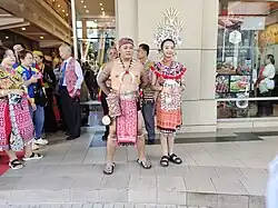 Women wear a handwoven cloth (kain betating) worn around the waist, a woven beaded chain over the neck and shoulders (marik empang), a rattan and brass ring high corset around the upper body, selampai (a long piece of scalp) worn over the shoulders, a decorated high-comb (sugu tinggi) over the hair lump (sanggul), a silver belt (lampit), anklet, armlet, as well as an orb fruit purse.[69] In the past, it was customary for Dayak women to bare their breasts as a sign of beauty.[69] Among the Orang Ulu Dayaks, stretched earlobes is also a standard of beauty, despite not widely practised among the newer generations due to the more popularly Westernised interpretation of beauty.[67]