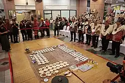 Another important activity is the singing of traditional poems. These include pantun, ramban, jawang, sanggai and pelandai.[88] Any honoured guests to longhouses may be asked to break open a coconut to symbolise the actions of Sengalang Burong (the god of war) which also means victory for the well-being and protection of the communities.[83] In the actual cleansing of the freshly taken heads, the troop leader would eat a bit of the brain with a piece of a glutinous rice before proceeding to throw away the rest of the brain using a piece of rattan swirled by him inside the skull and to slice out the flesh using his war sword. This coconut-splitting ceremony is a sign of respect and honour to the guests being offered to do so. Other merrymaking activities which may extend to the next day include blowpipe (sumpit) contests and traditional games such as arm wrestling (bibat lengan), small log pulling (betarit lampong), rope pulling (tarit tali) and foot-banging (bapatis) with some also engage in cockfighting.[89][90][91] In modern settings, sports include football, sepak takraw (rattan kickball) and futsal. Other parlour games are played such as egg rolling, plate passing to the tune of taboh music, running in gunny sacks, and balloon blowing, while karaoke and joget dance are also popular.[92]