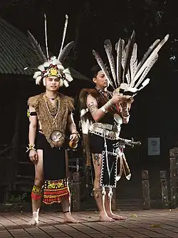 Men and women may wear ngepan, the traditional costume, especially when guests are arriving.[67] The traditional dress of men is a loincloth (sirat or cawat), animal skin coat (gagong), peacock and hornbill feathers (lelanjang) headwear, chains over the neck (marik), silver armlets and anklets along with a shield, sword, and spear.[68] Historically, Dayak men are decorated with tribal tattoos (kalingai or pantang in Iban) which signify their life experience and journey.[69] A frog design on the front of the man's neck and/or tegulun designs on the backs of the hand indicate the wearer has chopped off a human head or killed a man in military combat.[70] Most of the designs are based on headhunting and other spiritual significance.[71]