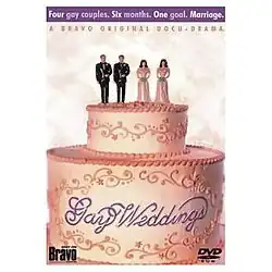 Gay Weddings is a 2002 American reality television series that aired on Bravo. The series, created by openly gay[1] producers Kirk Marcolina and Douglas Ross, followed two lesbian and two gay couples as they prepared for their wedding ceremonies. Each episode combined interview footage of the individual couples and their families and friends with footage of the various couples going through their wedding planning activities along with video diaries from the couples themselves.