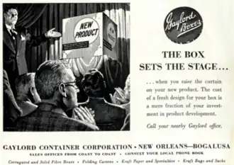 The company was named for a previous company of the same name, which made the eponymous Gaylord container, and was based in St. Louis, Missouri. It was acquired by Crown Zellerbach in 1955,[17][18][19] which renamed its brown paper operations the "Gaylord Container Division." The Gaylord name remained in CZ into the early 1980s,[20] then was reduced to "Container Division" shortly before the hostile takeover.
