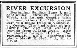 In June 1913, Gazelle was engaged in excursion work to Oregon City, Vancouver, and other points during the Portland Rose Festival, carrying up to 100 passengers at a time.[29]