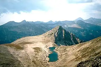 Gazey (Bulgarian: Газей) is a peak in the Pirin mountain, Bulgaria situated on a small sideward ridge of the Polejansli Ridge. It is 2,761 m high, which makes it ninth in the mountain.[1] Viewed from Polejan it looks small, rising slightly above the Upper Polejan lake but its western slopes are dizzy as they descent towards the valley of Damyanitsa. The peak looks majestic from the valley, it can be clearly seen even from the Razlog Valley. Below the larger peak tower a lower one which also looks imposing. The ridge of the same name forms a cirque in which the two Gazey lakes, some of the highest in the Balkans are located as well as the Gazey river.