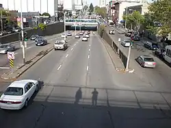 The section of the boulevard between Laguna and Divisadero Streets, passing through the Western Addition neighborhood, was widened in 1961, resulting in the demolition and displacement of residences and businesses in the corridor.[6] It features between four and eight through lanes and two grade separations at Masonic and Fillmore, complete with frontage lanes. There is a pedestrian overpass in the Japantown neighborhood at Webster Street; an additional overpass at Steiner Street was demolished in 2020.[7]