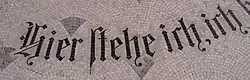A bronze likeness of Martin Luther stands on a pedestal made of Swedish granite in the centre of the Memorial Hall. This was a donation from the German-American Lutherans. In his left hand Luther is holding an open Bible, and his right hand is formed into a fist. With his right foot he is stamping on the papal bull of excommunication. Sunk into the ground are the words to remind of Luther's appearance at the Diet of Worms in 1521 ("Hier stehe ich, ich kann nicht anders, Gott helfe mir. Amen!", which mean "Here I stand. I can do nothing else, God help me. Amen.")