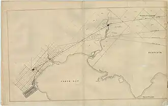In September 1853, Joseph La Trobe who was the Lieutenant-Governor of the colony marked the railway construction by turning on the first sod at Geelong station.[8][22] The construction process had not started until early 1854 but the project experienced a labour shortage due to the gold rushes hype at the current time.[16] The chairman announced in the second meeting of 1854 that the majority of required land from the terminus, Geelong station, to Cowies Creek station (now Corio station[23]) had been purchased or arranged with minimal difficulties.[19] Also, in the report, the chairman wrote that the Victoria government was generous and engaging as two hulks were placed at Cowies Creek (now Corio Bay[23]) to proceed the construction to Duck Ponds.[19]