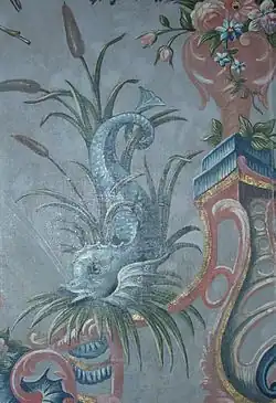 The Chinese Room has eight Rococo wallpaper panels on canvas with fantasy flowers and birds, vegetables and chinoiserie, made somewhere between the years 1765–1775. The artist, working in the cuir de Cordoue manufacture of Cornelis 't Kindt in Brussels, perhaps used engravings by Jean-Baptiste Pillement, then famous for his Chinoiserie.[12] The table is in scagliolatechnique, and once belonged to Frederick William III of Prussia.[13]