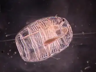 Gelatinous zooplankton are fragile animals that live in the water column in the ocean. Their delicate bodies have no hard parts and are easily damaged or destroyed.[2] Gelatinous zooplankton are often transparent.[3] All jellyfish are gelatinous zooplankton, but not all gelatinous zooplankton are jellyfish. The most commonly encountered organisms include ctenophores, medusae, salps, and Chaetognatha in coastal waters. However, almost all marine phyla, including Annelida, Mollusca and Arthropoda, contain gelatinous species, but many of those odd species live in the open ocean and the deep sea and are less available to the casual ocean observer.[4] Many gelatinous plankters utilize mucous structures in order to filter feed.[5] Gelatinous zooplankton have also been called Gelata.[6]