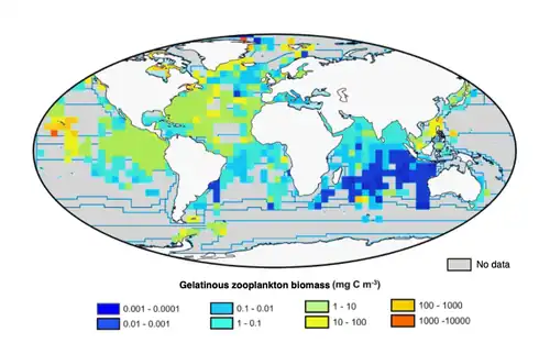 - ^ a b c Lucas, Cathy H.; Jones, Daniel O. B.; Hollyhead, Catherine J.; Condon, Robert H.; Duarte, Carlos M.; Graham, William M.; Robinson, Kelly L.; Pitt, Kylie A.; Schildhauer, Mark; Regetz, Jim (2014). "Gelatinous zooplankton biomass in the global oceans: Geographic variation and environmental drivers" (PDF). Global Ecology and Biogeography. 23 (7): 701–714. doi:10.1111/geb.12169.