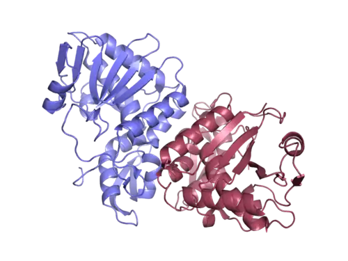 Gelonin is a 30 kDa protein.[2] Gelonin is a dimer, consisting of two identical monomers. Each monomer is composed of 251 amino acids, for a total of 502 residues. Gelonin is classified as an (α + β) protein, as its secondary structure consists of both beta sheets and alpha helices. Each monomer’s first 100 amino acids form 10 beta sheets, while their last 151 amino acids form 10 alpha helices. Gelonin’s two dimers are stabilized by hydrophobic interactions and hydrogen bonds. Specifically, the Asn22, Arg178, Asn180, and Lys237 residues of each monomer hydrogen bond with each other to stabilize the molecules. Likewise, the hydrophobic residues Tyr14, Ile15, Val16 and Pro38 from one monomer form hydrophobic interactions with the same residues in the adjacent monomer to further stabilize the dimer.[3]
