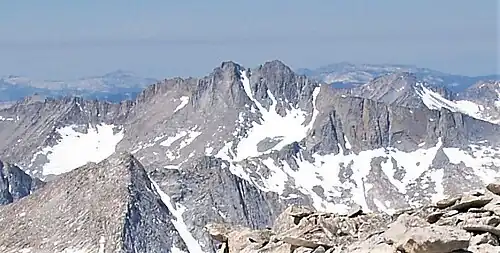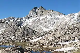 The first ascent of the summit was made July 30, 1953, by Jim Koontz and Rosemarie Lenel.[4] The mountain's name was suggested by Chester Versteeg, a prominent Sierra Club mountaineer from Los Angeles.[5] The peak's name was officially adopted in 1954 by the U.S. Board on Geographic Names and promulgated in 1957.[3] Today this peak draws climbing interest because it is included on the Sierra Peaks Section's peak bagging list.