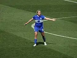 Lawley's involvement with the first team increased significantly in her second season, with 19 league appearances including 18 starts and a further six cup appearances.[4] She scored her first professional goal in a 3–2 loss to Reading on 23 January 2022. The goal came in the third minute of the game, a header from Lucy Quinn's corner.[6] On 4 May 2022, Birmingham City were relegated to the FA Women's Championship following a 6–0 defeat away at Manchester City with one game remaining.[7]