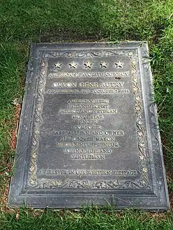 Autry died on October 2, 1998, at his home in Studio City, California from lymphoma.[40][41][42][43] He was buried at the Forest Lawn, Hollywood Hills Cemetery in Los Angeles. His epitaph read, "America's Favorite Cowboy ... American Hero, Philanthropist, Patriot and Veteran, Movie Star, Singer, Composer, Baseball Fan and Owner, 33rd Degree Mason, Media Entrepreneur, Loving Husband, Gentleman".[44]