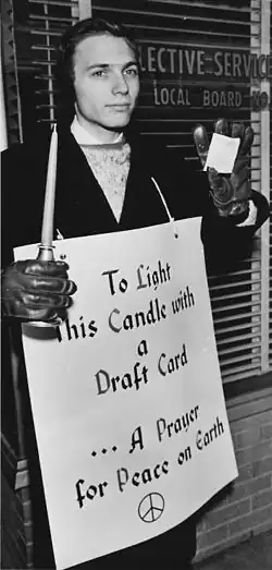 On December 24, 1963, he stood outside the draft board wearing a sign that read, "To Light This Candle with a Draft Card - A Prayer for Peace on Earth." He spoke to people throughout his twelve-hour vigil and at midnight, with about twenty-five people present, his girl friend Jane held the candle while he held the draft card with a pair of tongs and lit it with a lighter, then lit the candle.[3][9][10]
