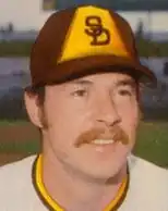 Tenace was one of several Athletics who became free agents after the 1976 season and participated in a newly created re-entry draft, in which teams acquired the rights to negotiate with veteran free agents. Tenace and teammate Rollie Fingers were the first players from that draft to sign, with both joining the San Diego Padres in December of that year.[21] In four years as a starter with the Padres, his power numbers dropped in part due to the cavernous dimensions of San Diego Jack Murphy Stadium, only reaching 20 home runs once; but his batting eye remained, recording three more seasons of 100 walks, with a career best of 125 in 1977. In 1979, Tenace led National League catchers with a .998 fielding percentage, committing only one error in 94 games.[22] He recorded an on-base percentage of over .390 in each of his years in San Diego, and finished third in the National League in that department in three consecutive years.[1]