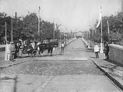 In 1890, a public tender was issued for replacing the wooden bridge, and the contract was granted to the Reșița Railway Company, led by engineer Henrik Reiber.[2] The Reiber family had constructed several significant buildings in the city, with the Dicasterial Palace being the most notable. However, due to bureaucratic delays, the bridge's construction was postponed. The steel bridge was ultimately finished in 1891, featuring a 30-meter opening, a 5.6-meter-wide roadway, and two pedestrian walkways, each 1.5 meters wide.[3] It was officially opened during the South Hungarian Industrial and Agricultural Exhibition held in Timișoara. With Emperor Franz Joseph in attendance, it was subsequently referred to as the Franz Joseph Bridge.[1]