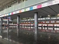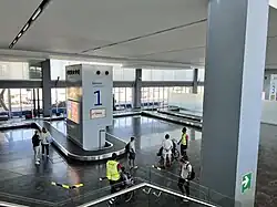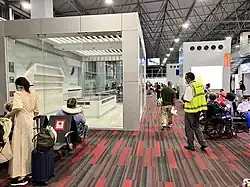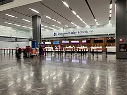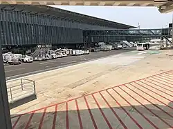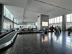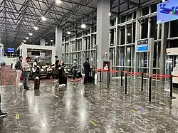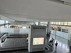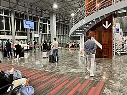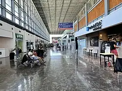 The main hall serves essential functions, including check-in and baggage handling on the eastern side, and the arrivals section on the west side, which includes customs and immigration facilities. The arrivals section also offers car rental services, taxi stands, snack bars, and souvenir shops. The upper floor of the terminal houses the security checkpoint and a 3,600 square metres (39,000 sq ft) departure lounge equipped with a food court, duty-free shops, a VIP lounge, and a concourse with six gates, three of which are equipped with jet bridges.[9]