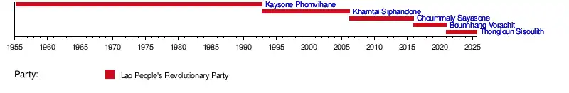 General Secretary of the Central Committee of the Lao People's Revolutionary Party is the office of the highest-ranking member of the Lao People's Revolutionary Party (LPRP). Since the party's takeover in 1975, its leader has been the supreme leader of Laos.[1] The General Secretary is also the Chairman of the Defense and Public Security Commission, the commander-in-chief of the Lao People's Armed Forces. From 1991 to 2006, the office was titled Chairman of the Central Committee of the Lao People's Revolutionary Party. The Party's Central Committee elects the General Secretary. The General Secretary usually also becomes President of Laos eventually, though from 1975 to 1991 and from 1992 to 1998 he was usually Prime Minister.