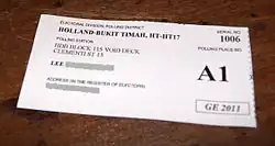On nomination day, the returning officer and their representatives will be present at designated nomination centres between 11:00 am and 12:00 noon to receive prospective candidates' nomination papers, political donation certificates, and minority certificates (if required).[52] Each nomination paper must contain a statement signed by the prospective candidate that they consent to the nomination; must include a statutory declaration by the prospective candidate that they are qualified to be elected; and must be signed by a proposer, a seconder, and four or more persons as assentors, each of whom must be a person on the register of electors for the electoral division in which the person seeks election.[53] Since the 2011 Presidential election, candidates are also recommended to submit their recent passport photo with a size of no more than 2 MB and 400 x 514 pixels,[54] to the Election Department as photographs are printed to the ballot paper for better identification.[55][56]