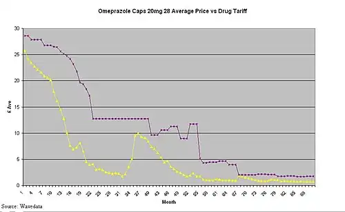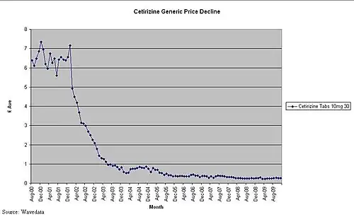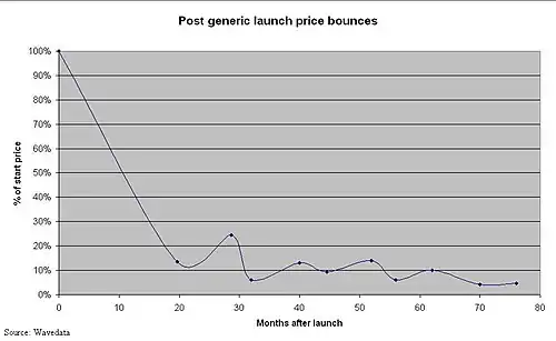 Generic pharmaceutical price decay is what happens (in the UK) once the originator brand has lost its patent exclusivity (patent expiry) and generic versions of the originator brand have been launched.[1][2][3][4][5][6]