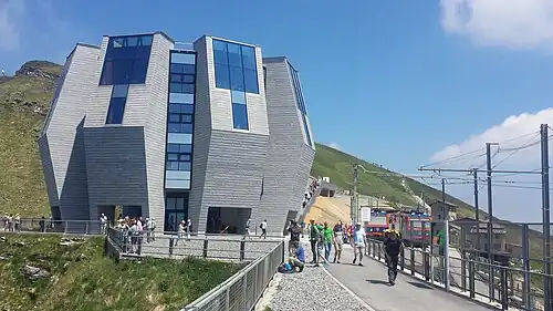 The old station building, which had a buffet, a restaurant and a hotel, closed at the end of the 2013 season and was demolished. A new building, designed by Mario Botta and including buffet, restaurant and rooftop viewing gallery, opened on 8 April 2017. In the meantime, the railway remained closed to passengers although it was used for the transport of construction materials and workers. The new building is known as the Fiore di Pietra or stone flower.[3][4]