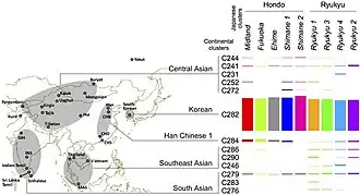 Ancestry profile of Japanese genetic clusters illustrating their genetic similarities to five mainland Asian populations.[41]