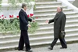 On November 19, 1985, Reagan and Gorbachev met for the first time at Fleur d'Eau.[9] When the Soviet motorcade deposited Gorbachev at the driveway of Fleur d'Eau's eastern facade, Reagan emerged from the villa without his coat to greet him. Commentators later contrasted the image of Reagan in a blue suit next to Gorbachev in an overcoat, seemingly as a sign of Reagan’s vitality. Reagan had been wearing an overcoat and scarf, but was urged by his personal aide, Jim Kuhn, to take them off for appearance’s sake.[8][10]