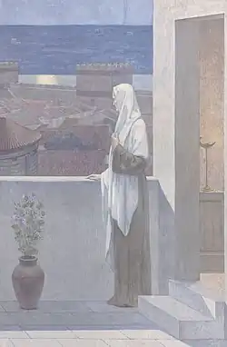 The most notable artistic representations of Genevieve, which continued traditions from the late Middle Ages, were created between the 17th and 19th centuries, including the frescoes of Pierre Puvis de Chavannes in the Panthéon.[4][67] Several iconographic images depicting Genevieve's water-based miracles were created during the Middle Ages, including a small bas-relief as part of her effigy in the portal of Notre-Dame, which also depicted the well in Navarre where Genevieve retrieved the water that healed her mother. A statue in the Abbey of Saint Genevieve, in the shape of a fountain, depicted her holding a candle with water flowing from the tip. Another small statue, erected inside the abbey's shrine, near the altar, depicted her with the emblem of Paris at her feet, and holding a key to heaven and a scepter.