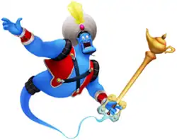 His role in the first Kingdom Hearts (2002) is mostly the same as in the film as his lamp is found by Aladdin. The general difference is that all of Aladdin's wishes are wasted to get him out of trouble: the first wish was spent on getting rid of Heartless attacking and the second one is to rescue Princess Jasmine from Jafar. Eventually, Iago steals the Genie's lamp, forcing him to show Jafar the keyhole of Agrabah and assist him in fighting Sora and his friends. After Jafar is defeated, Aladdin wishes the Genie free from his lamp. He then becomes a summon for Sora.[14][15]
