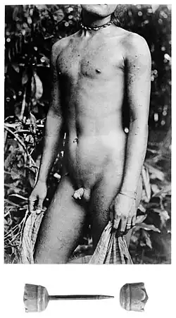 In the Philippines, penile piercings were widely documented by European explorers among the Visayan people.[8] Visayan penile piercings consists of a rod or bar (usually made from gold, brass, tin, or ivory; and often ornamented) called the tugbuk or tudruk that is inserted horizontally through the glans of the penis. Its ends are attached to the sakra (also transcribed as sacra or sagra), a wheel or half-ring (made from the same material as the tugbuk) that goes around the head of the penis, similar to a cock ring. The sakra comes in many variants, but is usually ornamented with blunt knobs around the circumference. The ends of the tugbuk are then secured to the sakra with plugs (also often ornamented). The Italian explorer Antonio Pigafetta who accompanied Ferdinand Magellan in the first circumnavigation of the globe describes the practice as such:[8][9][10][11][12]