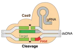 - ^ a b Zhang F, Wen Y, Guo X (September 2014). "CRISPR/Cas9 for genome editing: progress, implications and challenges". Human Molecular Genetics. 23 (R1): R40-6. doi:10.1093/hmg/ddu125. PMID 24651067.