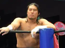 On November 30, 2000, Gentaro made his debut for Dramatic Dream Team (DDT), teaming with Takashi Sasaki in a tag team match, where they defeated Kengo Takai and Yuki Nishino.[14] Gentaro began working regularly for the promotion in October 2001, when he started a storyline rivalry with Mikami.[15] On November 1, Gentaro won his first title in DDT, when he and Yoshiya defeated Mikami and Thanomsak Toba to win the vacant KO-D Tag Team Championship.[16] Gentaro and Yoshiya made their first successful defense on November 30, defeating Mikami and Toba in a rematch, with Gentaro pinning his rival for the win.[15] However, on December 12, Mikami came back and pinned Gentaro to make himself and Gentaro's former partner Takashi Sasaki the new KO-D Tag Team Champions.[16] On June 6, 2002, Gentaro received his first shot at DDT's top singles title, the KO-D Openweight Championship, when he unsuccessfully challenged Kintaro Kanemura.[7] In July, Gentaro reunited with Takashi Sasaki, under the team name Akarangers, to take part in the 2002 KO-D Tag League, where they would finish third.[7][17] On October 24, the Akarangers defeated Mikami and Thanomsak Toba in a Championship vs. Championship match to retain the WEW World Tag Team Championship and win the KO-D Tag Team Championship.[16] On November 14, Gentaro defeated Sasaki and Tomohiko Hashimoto in a three-way match to become the number one contender to the KO-D Openweight Championship.[7] On November 29, Gentaro defeated Sanshiro Takagi to also become the new KO-D Openweight Champion.[18] However, his reign would last less than a month, as he was defeated by his rival Mikami on December 22, in a four-way match, which also included Sanshiro Takagi and Tomohiko Hashimoto.[18] On January 4, 2003, Gentaro made his first appearance as the kabuki mask wearing Benten, taking part in a battle royal for the Ironman Heavymetalweight Championship.[19] Benten has since also made appearances for Kaientai Dojo,[20] Apache Pro-Wrestling Army,[21] New Japan Pro-Wrestling,[22] and Union Pro Wrestling.[23] On January 31, 2003, Gentaro and Sasaki lost the KO-D Tag Team Championship to Sanshiro Takagi and Tomohiko Hashimoto.[16] Shortly afterwards, Gentaro left DDT for the remainder of the year,[19] returning in early 2004, when he reunited with Sasaki, with the two defeating Hero! and Kudo on February 11 to regain the KO-D Tag Team Championship.[16] After three successful defenses, they lost the title to Ryuji Ito and Sanshiro Takagi on July 1.[24] On September 30, Gentaro won the Ironman Heavymetalweight Championship two times during a ten-minute battle royal, but was unable to leave the match with the title.[25] From October 2004 to December 2009, Gentaro only made fifteen appearances for DDT, but still managed to win the Ironman Heavymetalweight Championship for the third time on April 9, 2008, and losing it two days later.[26][27]