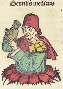 Gentile Gentili[1] da Foligno (died 18 June 1348) was an Italian professor and doctor of medicine, trained at Padua and the University of Bologna, and teaching probably first at Bologna, then at the University of Perugia, Siena (1322–1324), where his annual stipend was 60 gold florins;[2] he was called to Padua (1325–1335) by Ubertino I da Carrara, Lord of Padua, then returned to Perugia for the remainder of his career. He was among the first European physicians to perform a dissection on a human being (1341),[3][4] a practice that had long been taboo in Roman times. Gentile wrote several widely copied and read texts and commentaries, notably his massive commentary covering all five books of the Canon of Medicine by the 11th-century Persian polymath Avicenna, the comprehensive encyclopedia that, in Latin translation, was fundamental to medieval medicine. Long after his death, Gentile da Foligno was remembered in the Nuremberg Chronicle (1493) as Subtilissimus rimator verborum Avicenne, "that most subtle investigator of Avicenna's teachings"[5]