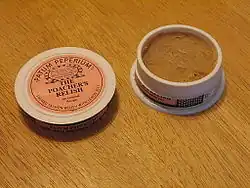 Gentleman's Relish, also known as Patum Peperium (meaning "pepper paste" in Latin), is a British brand of anchovy paste created in 1828 by John Osborn.[1] It is a savoury paste with a salty and slightly fishy taste, and contains salted anchovies (minimum 60%), butter, herbs and spices. Today, the secret recipe is withheld from all but one employee at Elsenham Quality Foods in Elsenham, England, the licensed manufacturer.[1][2]