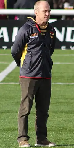 Geoffrey Toovey (born 17 June 1969), also known by the nickname of "Toovs" or "Tooves",[2] is the former head coach of the Bradford Bulls and former professional rugby league footballer. Toovey played halfback and Five-Eighth for the Manly-Warringah Sea Eagles, then played as a hooker later in his career at the Northern Eagles. He played 286 first-grade matches in all, and captained Manly to the 1996 ARL premiership and the 1995 and 1997 grand finals. He played in 13 international matches for Australia between 1991 and 1998. Toovey is the former head coach of Manly-Warringah.