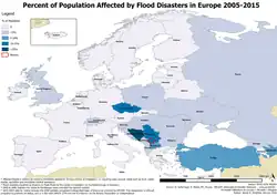 Percent of population affected by Flood Disasters in Europe by country from 2005 to 2015.