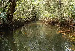 The southern mountain ranges drain to the south and west towards the shallow sea. Sediments on the continental shelf are the basis for extensive mangroves marshes, in particular in the Koh Kong province and the Ream National Park.[39][59]